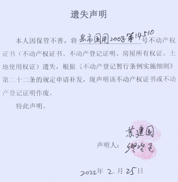 遗失声明(缪碧君、苏建国)