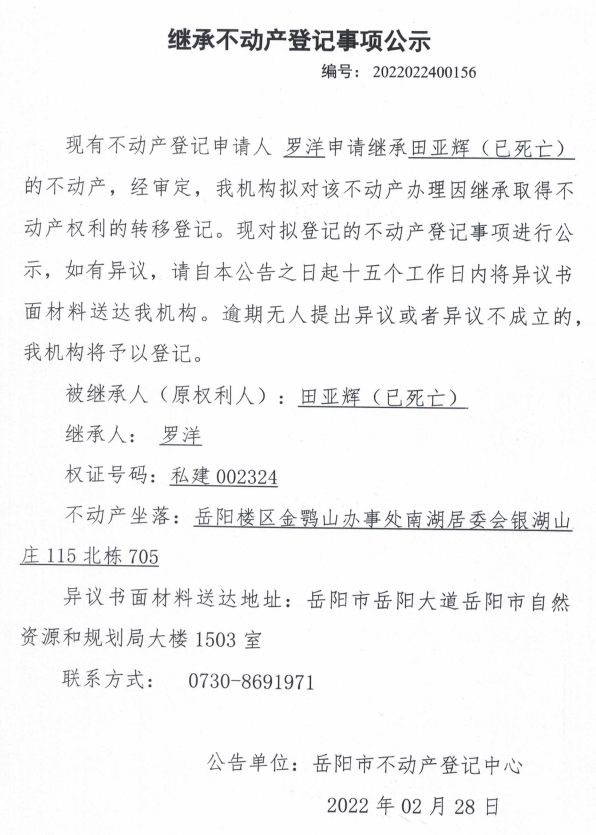 继承不动产登记公示 编号:(罗洋)