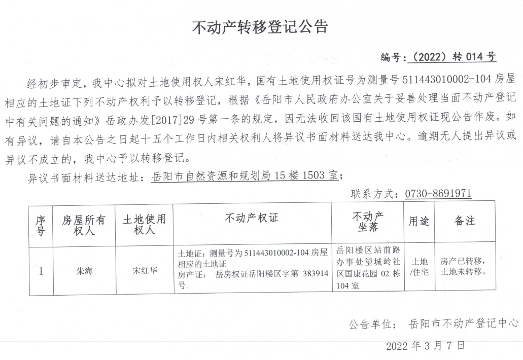 不动产转移登记公告 编号:(2022)转014号(宋红华)
