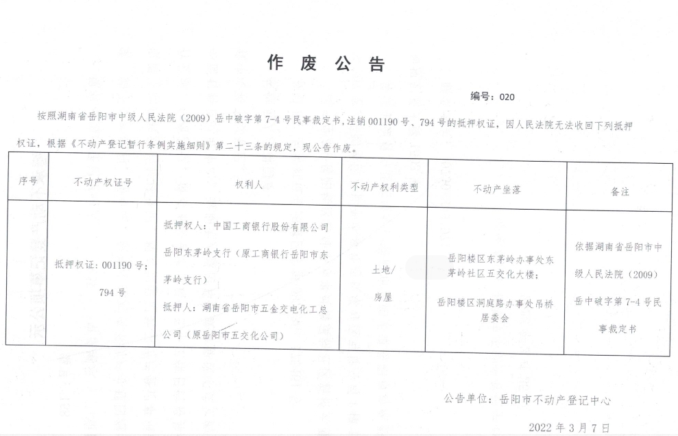 作废公告 编号:020(中国工商银行股份有限公司岳阳东茅岭支行(原工商银行岳阳市东茅岭支行)) 001