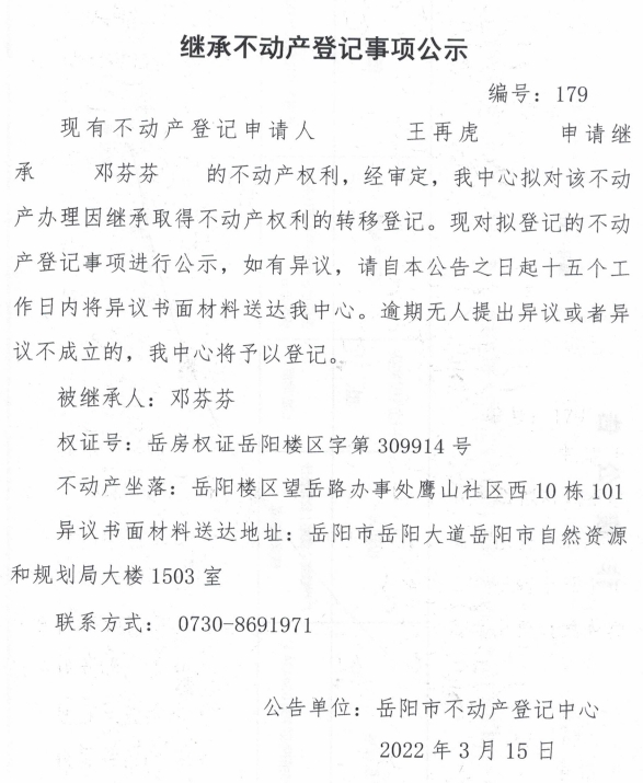 继承不动产登记公示 编号:(王再虎)