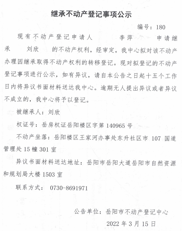 继承不动产登记公示 编号:(李萍)