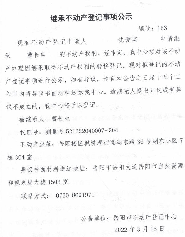 继承不动产登记公示 编号:(沈爱英)