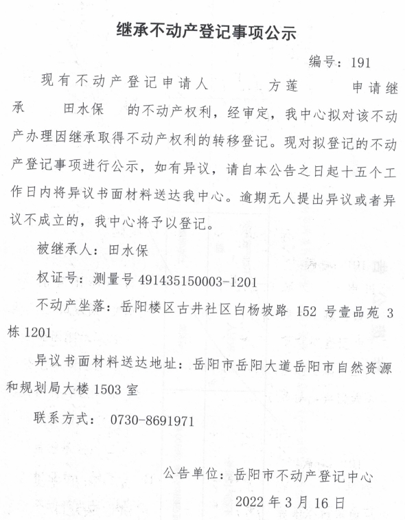 继承不动产登记公示 编号:(方莲)
