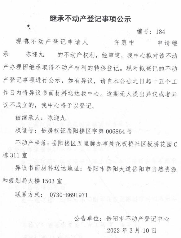 继承不动产登记公示 编号:(许惠中)