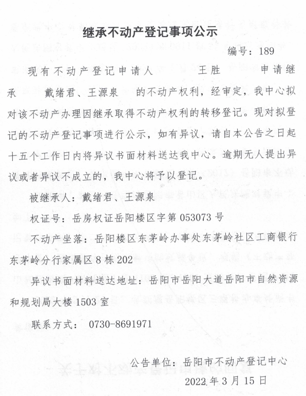 继承不动产登记公示 编号:(王胜)
