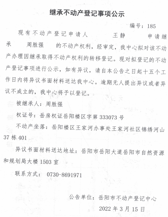 继承不动产登记公示 编号:(王静)