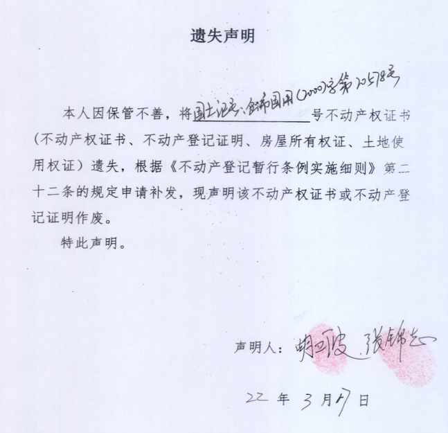 遗失声明(张锦志、胡卫波)