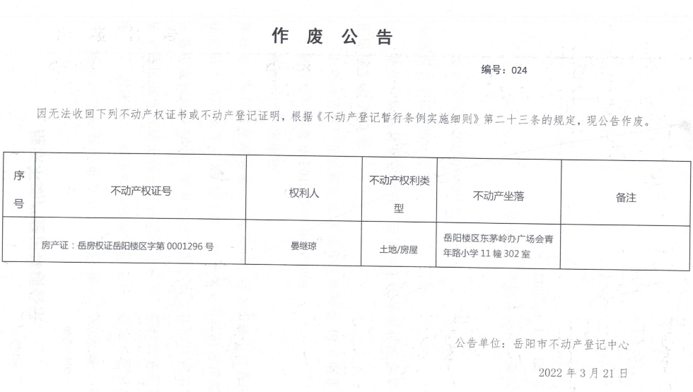 作废公告 编号:024(晏继琼)