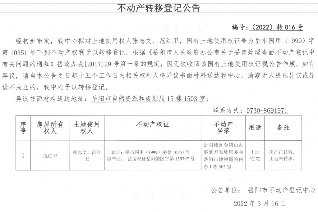 不动产转移登记公告 编号:(2022)转016号(张志文、范红卫)