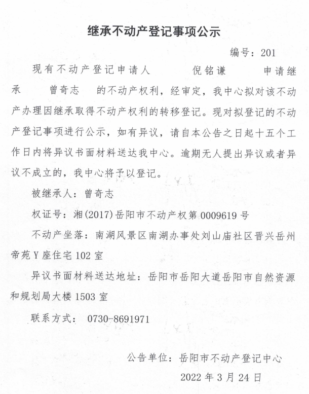 继承不动产登记公示 编号:(倪铭谦)