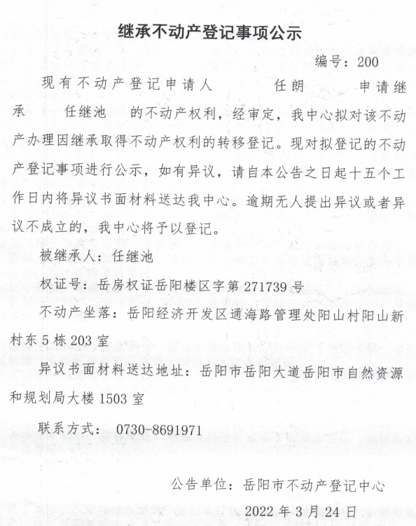 继承不动产登记公示 编号:(任朗)