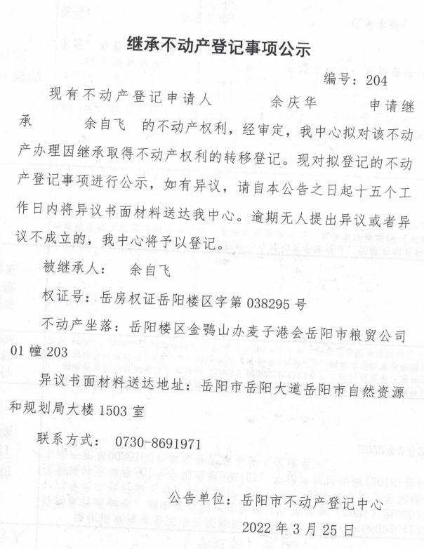 继承不动产登记公示 编号:(余庆华)
