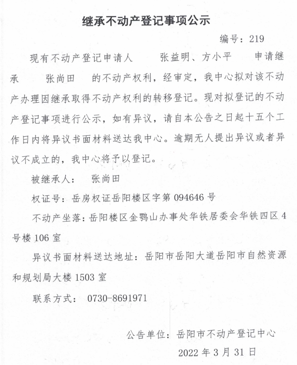 继承不动产登记公示 编号:(方小平)