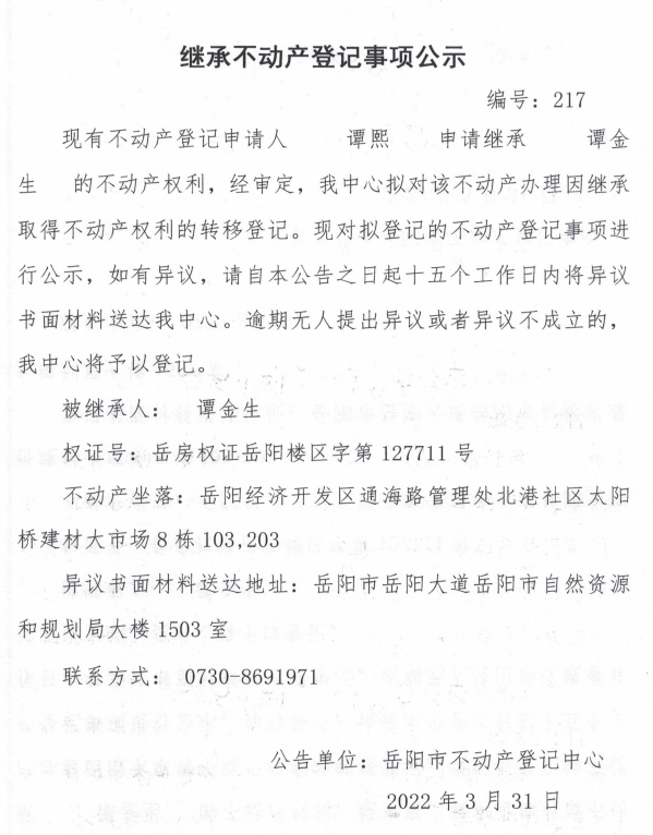 继承不动产登记公示 编号:(谭熙)