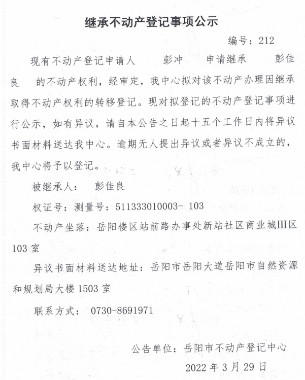 继承不动产登记公示 编号:(彭冲)