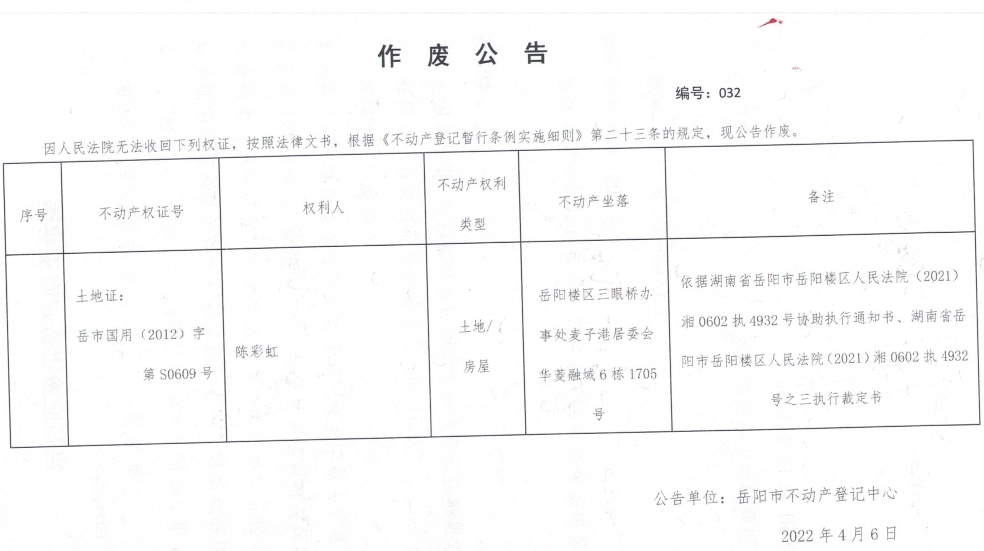 作废公告 编号:032(陈彩虹)