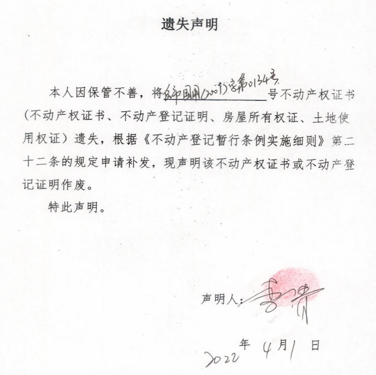 遗失声明(李清)