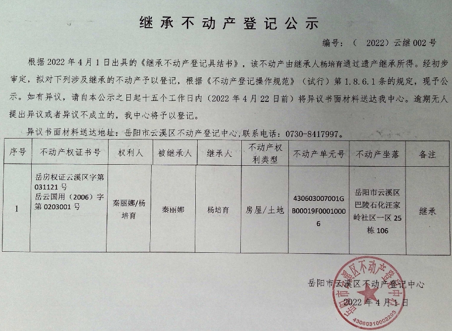 继承不动产登记公示 编号:(2022)云继002号