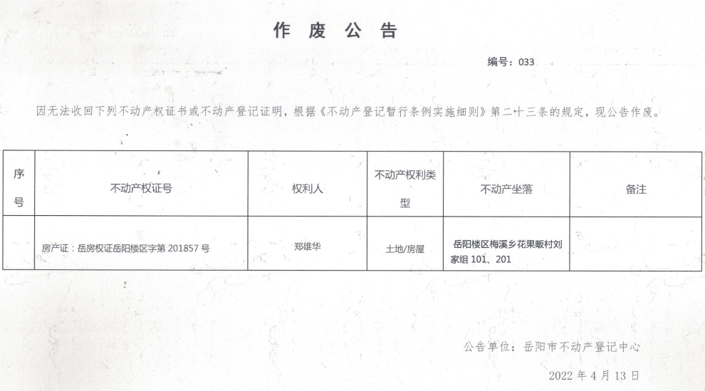 作废公告 编号:033 (郑雄华)