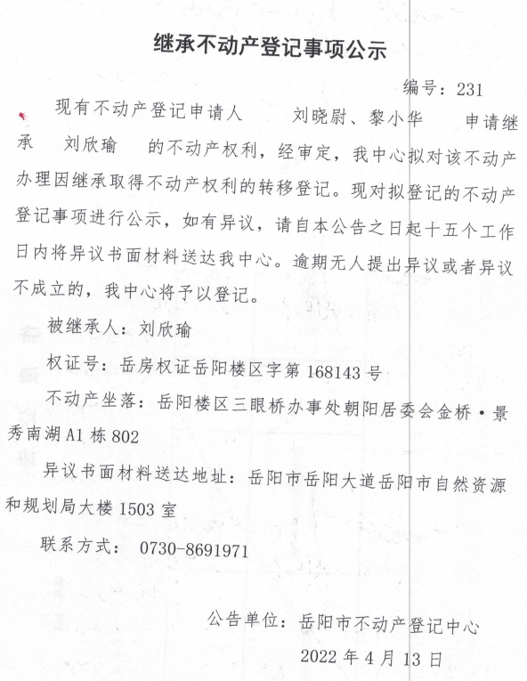 继承不动产登记公示 编号:(刘晓尉)