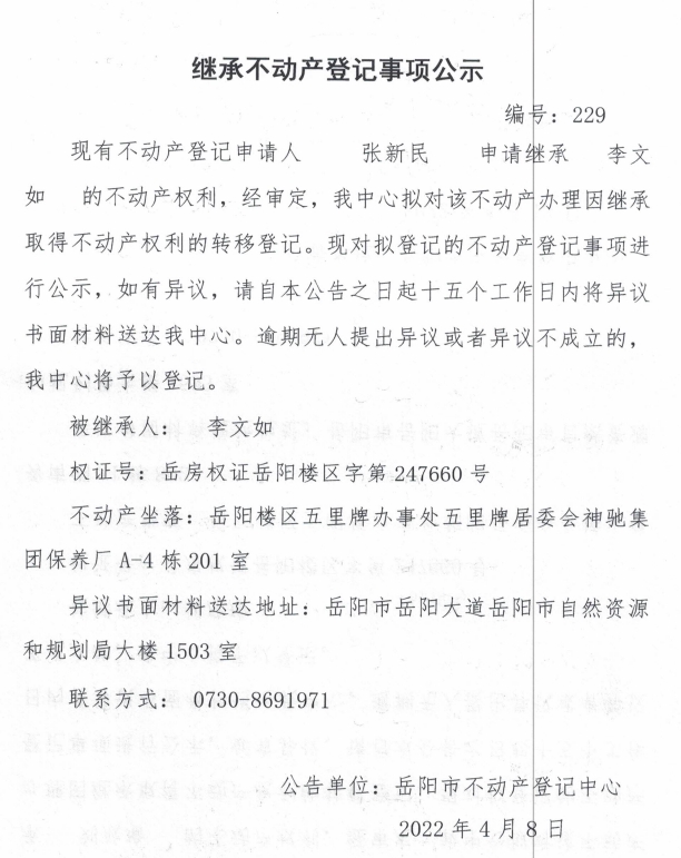 继承不动产登记公示 编号:(张新民)