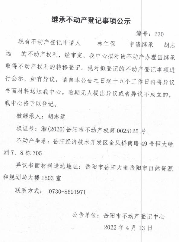 继承不动产登记公示 编号:(林仁保)