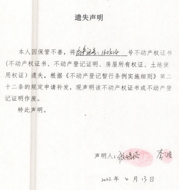 遗失声明(张煜琦、李波 )