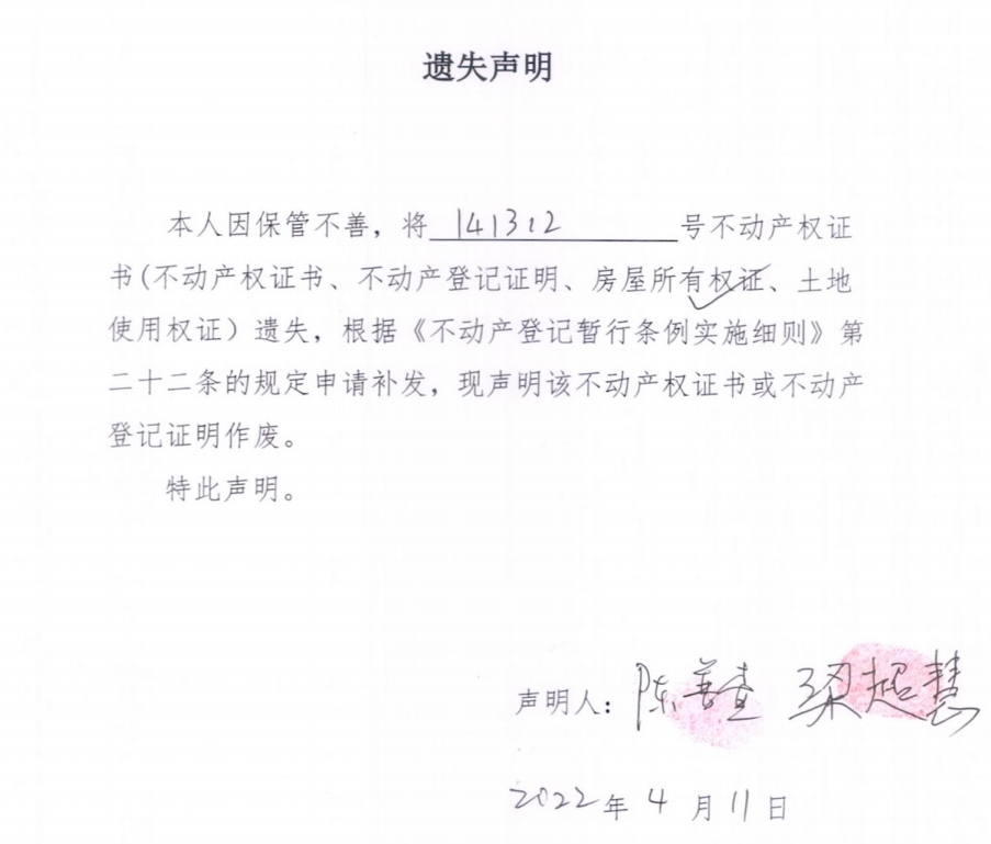 遗失声明(梁超慧、陈普查)
