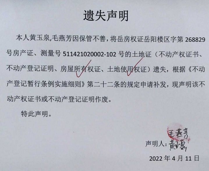 遗失声明(黄玉泉、毛燕芳)