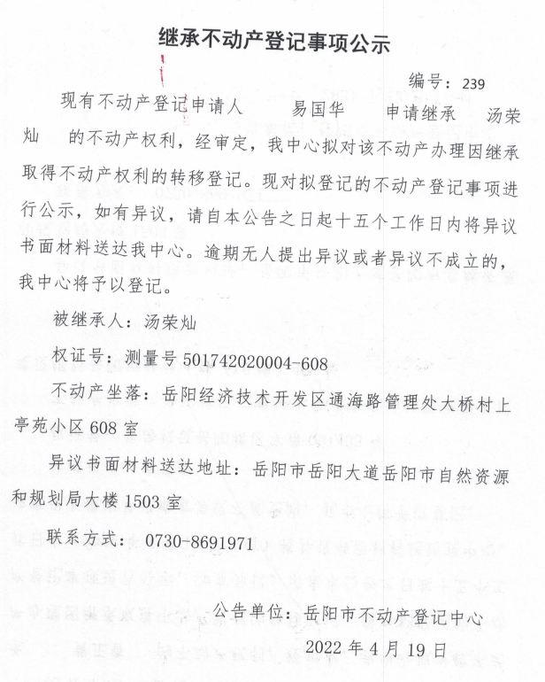 继承不动产登记公示 编号:(易国华)