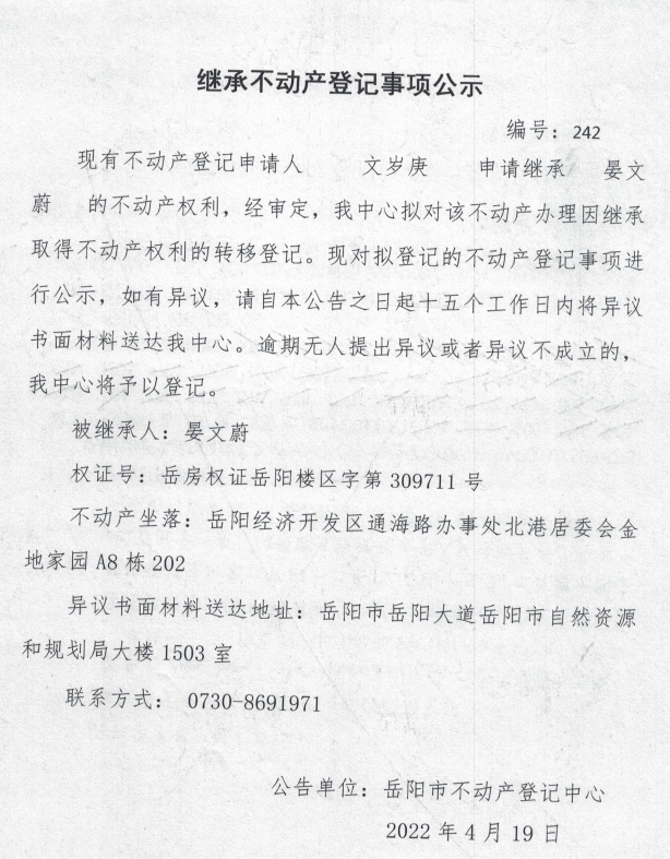 继承不动产登记公示 编号:(文岁庚)
