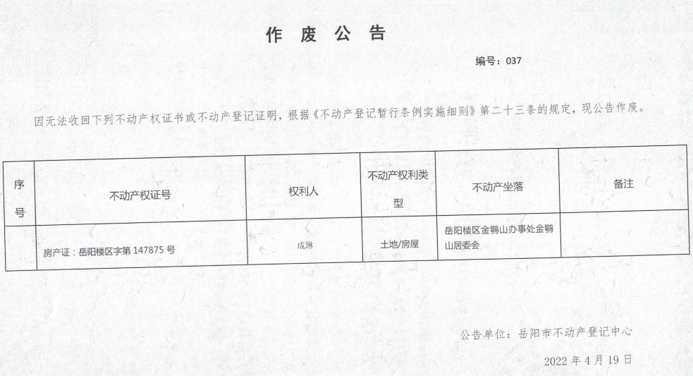 作废公告 编号:037(成琳)