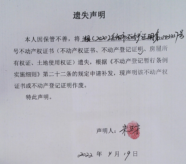 遗失声明(抵押权人兴业银行股份有限公司岳阳分行;抵押人朱正才、姚翠红)
