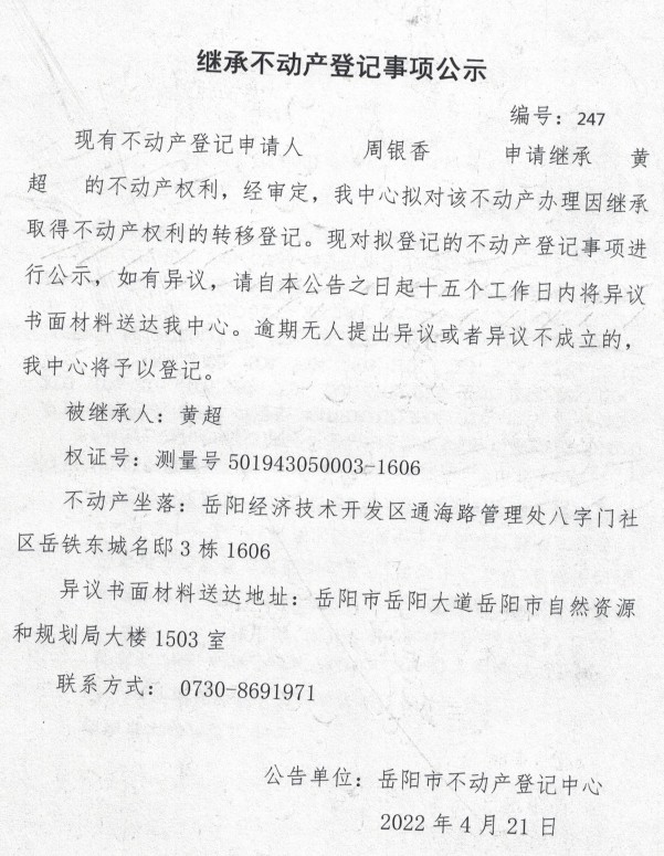 继承不动产登记公示 编号:周银香