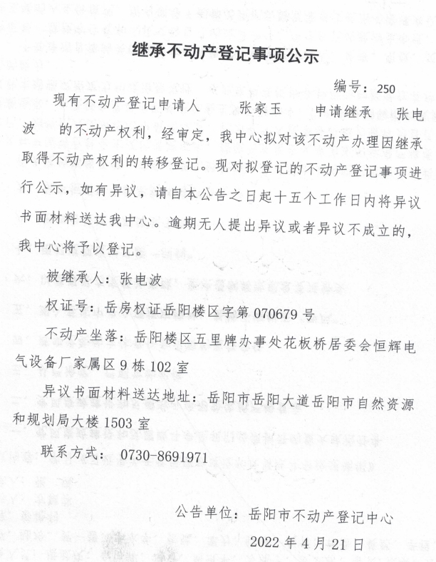 继承不动产登记公示 编号:张家玉