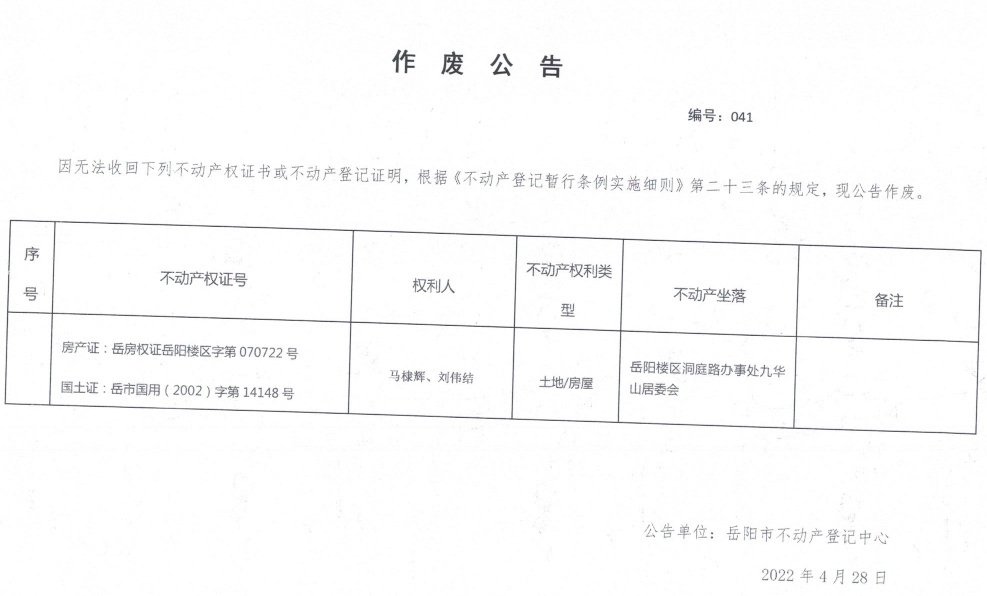 作废公告 编号:041(马棣辉、刘伟结)