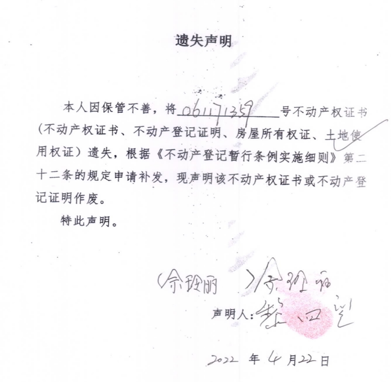 遗失声明(黎四望、佘玲丽 )
