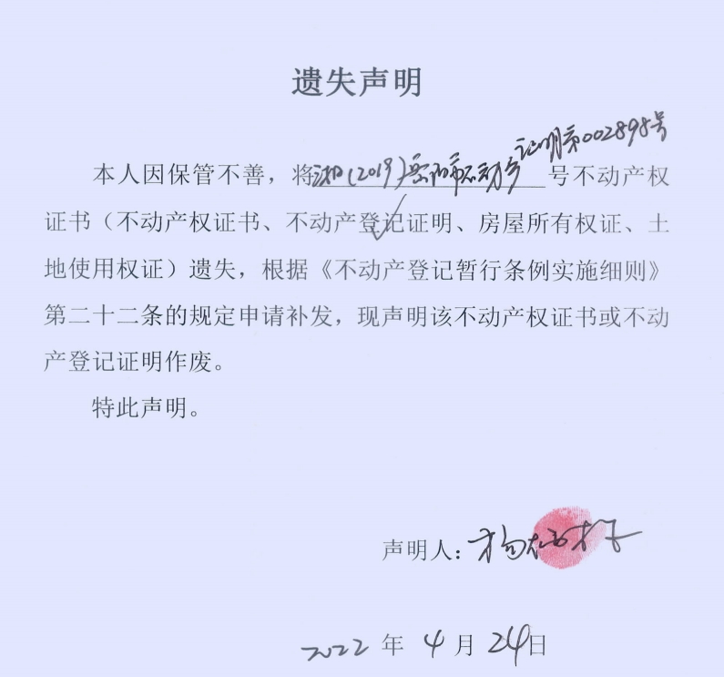 遗失声明(杨炳林、夏小玲)