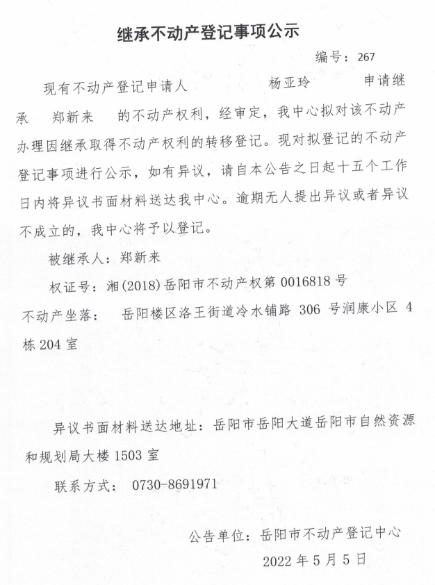 继承不动产登记公示 编号:杨亚玲