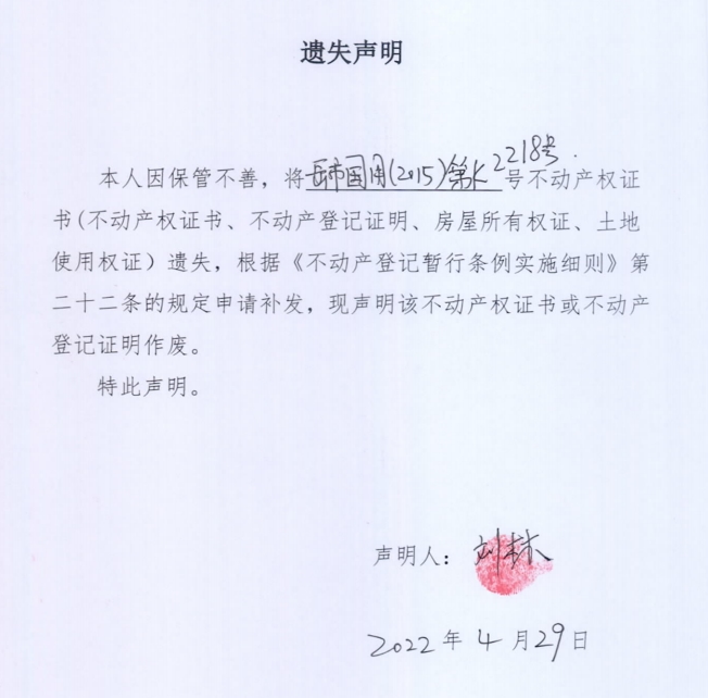 遗失声明(刘林)