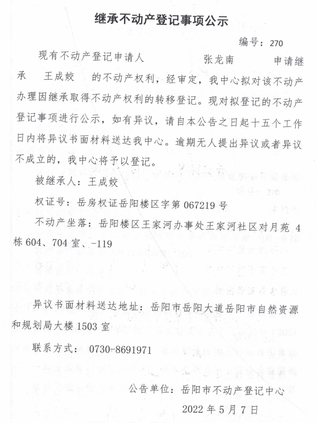 继承不动产登记公示 编号:张龙南