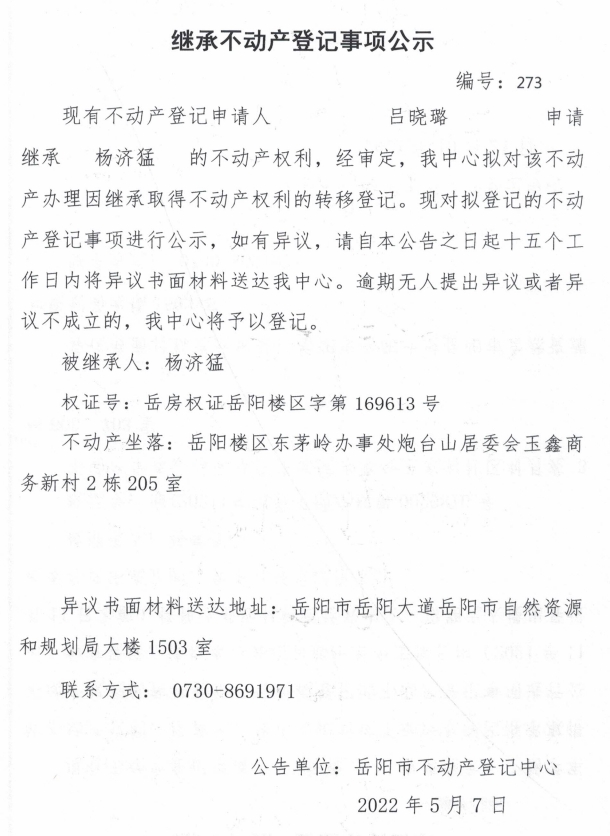 继承不动产登记公示 编号:吕晓璐