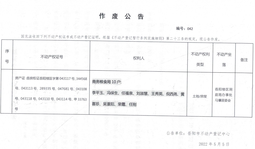 作废声明 编号:042(商务粮食局李平玉、冯保生等10户)