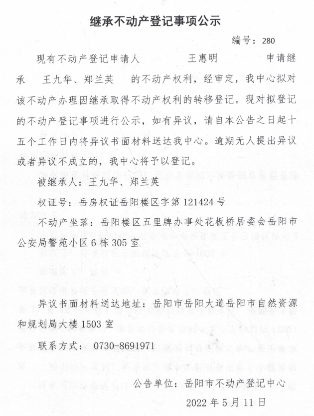 继承不动产登记公示 编号:王惠明
