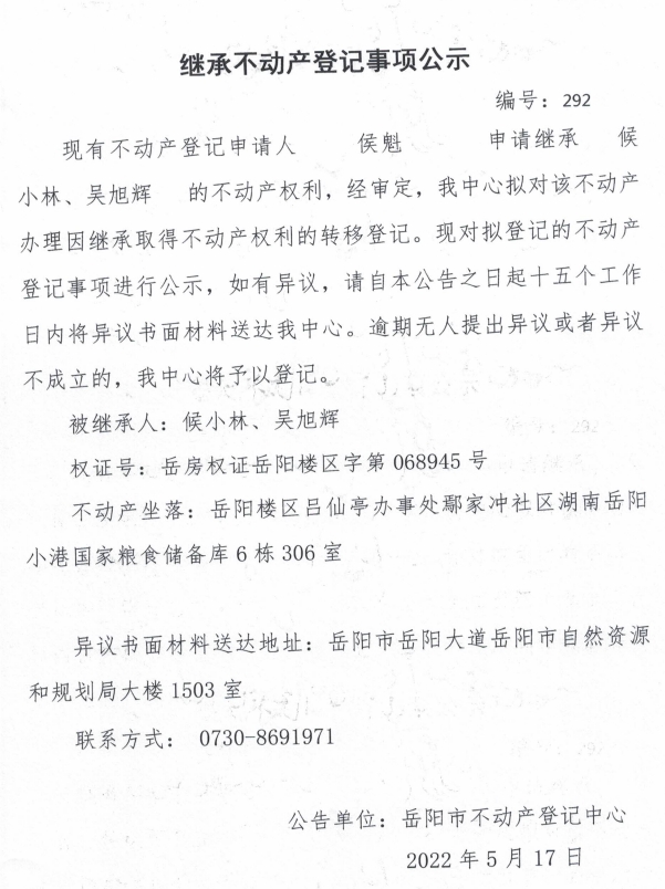 继承不动产登记公示 编号:候魁