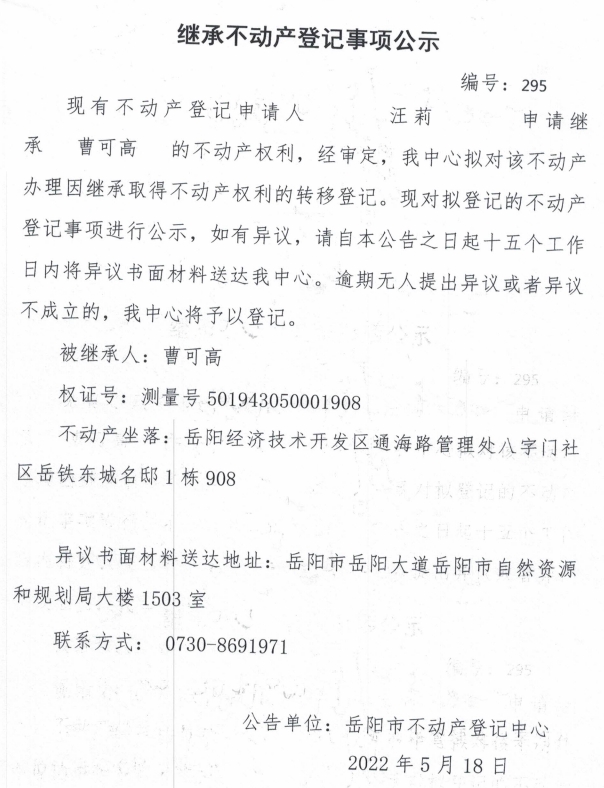 继承不动产登记公示 编号:汪莉