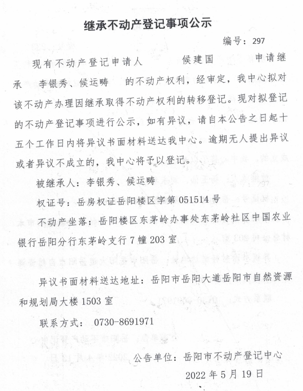 继承不动产登记公示 编号:候建国