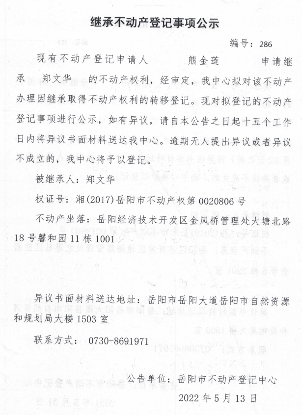 继承不动产登记公示 编号:熊金莲
