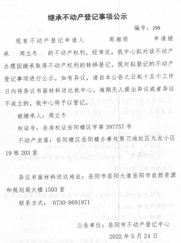 继承不动产登记公示 编号:周湘雨